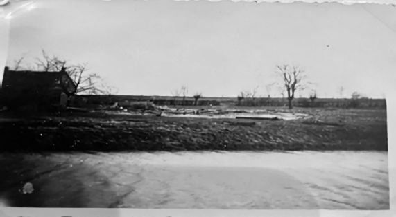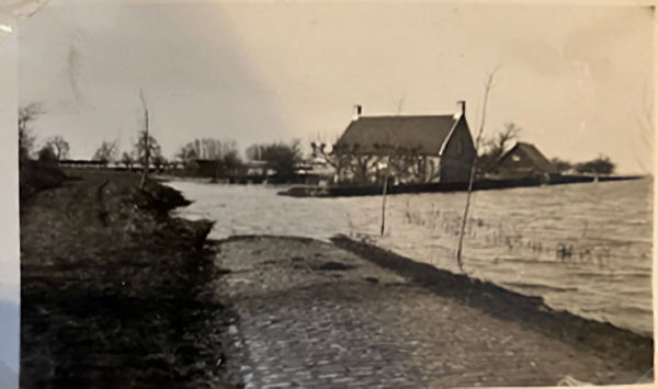 De ondergelopen boerderij van Vink in ’t Hoogland waar Ko later op is gaan boeren.In de verte de Hooglandsedijk die niet is doorgebroken.