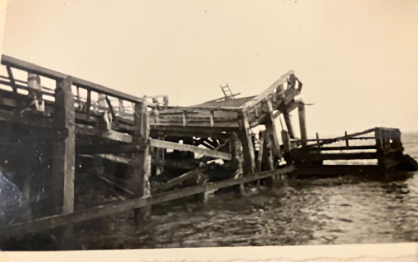 De verwoeste aanlegsteiger in Walsoorden