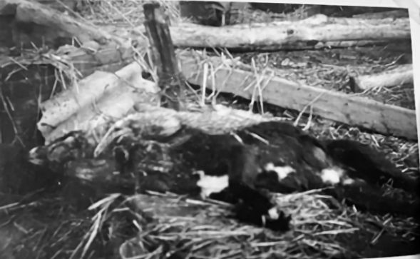 hangend in de prikkeldraad van een weiland. De overige familieleden bleven voor
