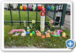 Tussen de tulpen, kuikentjes en vrolijk beschilderde eieren zitten de kabouters er al helemaal klaar voor. De versieringen hangen speels aan het hekwerk, terwijl op het gras een bont gezelschap van paashazen en paasfiguren staat opgesteld. Het geheel vormt een charmant en vrolijk hoekje dat de straat meteen een feestelijk tintje geeft.