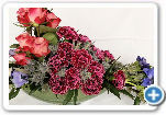 Met een oude, langwerpige schaal en veel bloemen werd woensdag een klassieke driehoekschikking gemaakt. Veel prachtige bloemen, in groepen gestoken, op verschillende hoogten, niet te veel bladmateriaal, verder niks ingewikkelds. Door de keuze van kleur en de soort bloemen zijn het allemaal totaal verschillende bloemwerken geworden. Het resultaat maakte iedereen blij.
