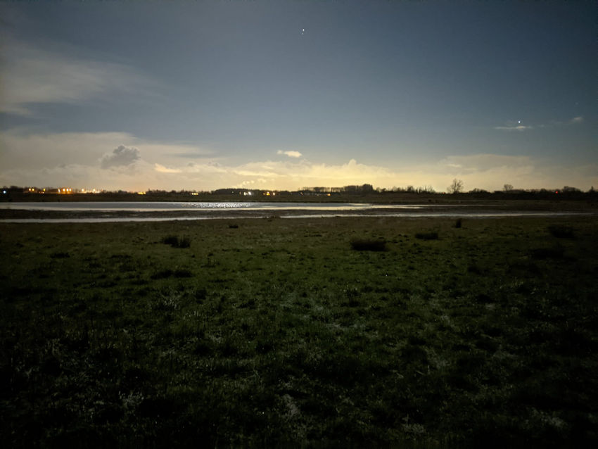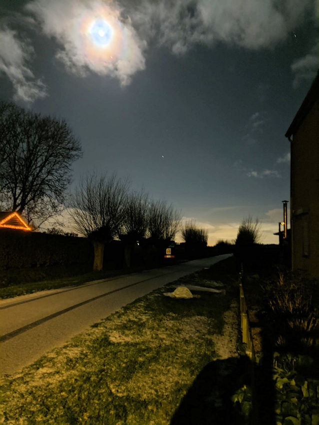 Naast de frisse wind was er ook de volle maan, zij het grotendeels van de avond verscholen achter de wolken. Tussen 20:00 en 21:00 uur prikte hij er even tussendoor. Het lichte sneeuwtapijt zorgde voor een mooie reflectie van dit maanlicht.