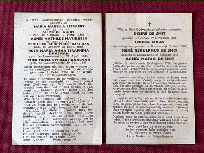 ‘’In deze polder werden door de vloedgolf twee huizen letterlijk weggeslagen en hierbij verdronken acht personen, waaronder vier kinderen. Vooral de familie Smit werd zwaar getroffen en telt vier slachtoffers. Ook van de familie Daalman vonden een vrouw en een kind de dood in de kolkende golven.’’