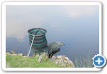 aan het water, in de typische houding die ze aannemen na een duik — met gespreide vleugels, badend in het winterzonnetje.