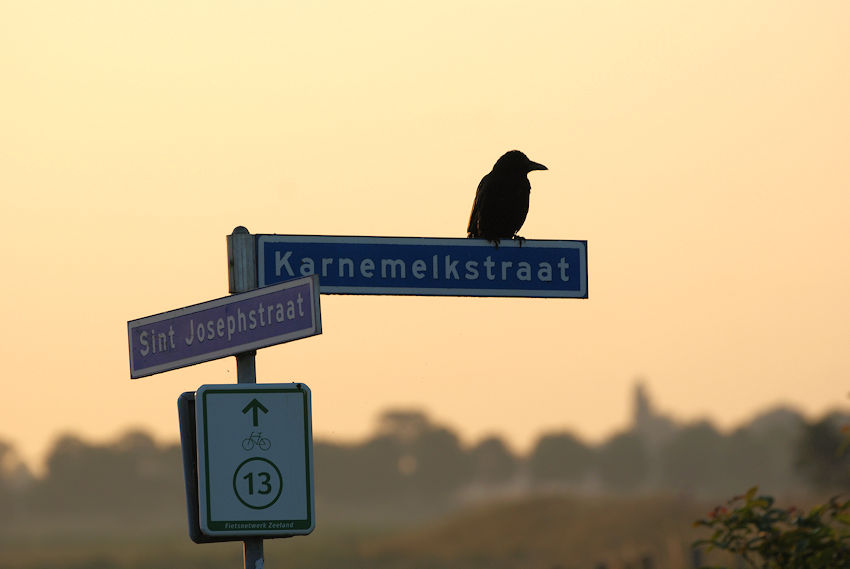 Op een frisse ochtend streek een kraai neer op het bord van de Karnemelkstraat.