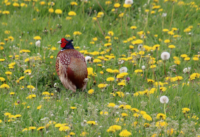 We hadden deze fazant al een keer eerder in de tuin opgemerkt, nu zagen we hem in een weiland op de Tasdijk. Een heel bijzonder exemplaar: eentje zonder staart.