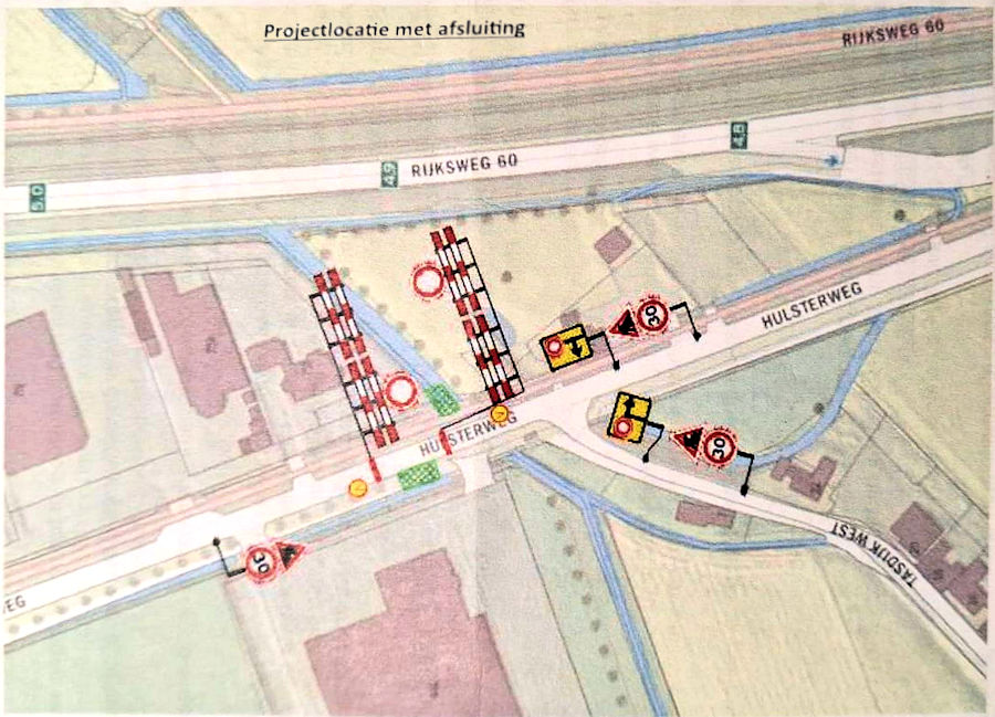 Voor het verkeer wordt een omleiding ingesteld via Hulsterweg–Groenendijk–Hulsterweg en omgekeerd. Fietsers en bromfietsers worden omgeleid via Oudeweg–Hoek en Bosch–Kwikstraat–Tasdijk–Hulsterweg en omgekeerd.