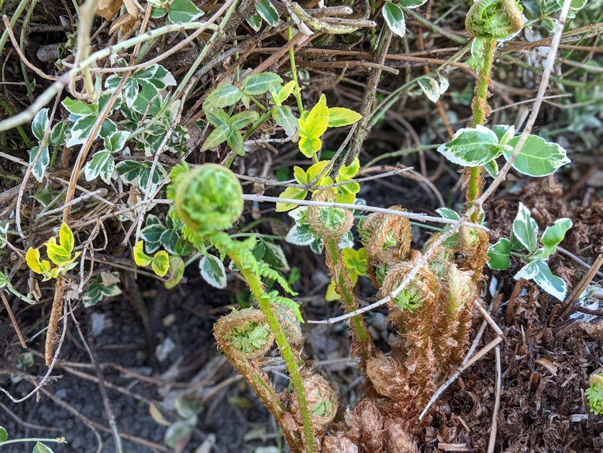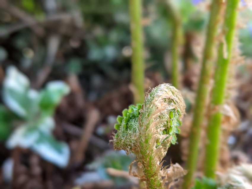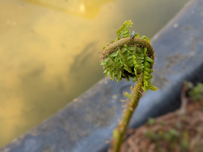 Met het warmer worden komt de natuur weer tot leven. Soms is dat wel op een heel boeiende wijze. Zo komen we een varen tegen. Hij staat bij de vijver, heeft dus geen last van droogte. Een beetje een schaduwplant, als hij genoeg water krijgt kan hij ook best wel wat zon af. We hebben hem heel de winter niet gezien. Opeens ontrolt hij nu één voor één zijn bladeren. Veel fantasie is er niet voor nodig om je door deze varen in een sprookjeswereld te wanen.