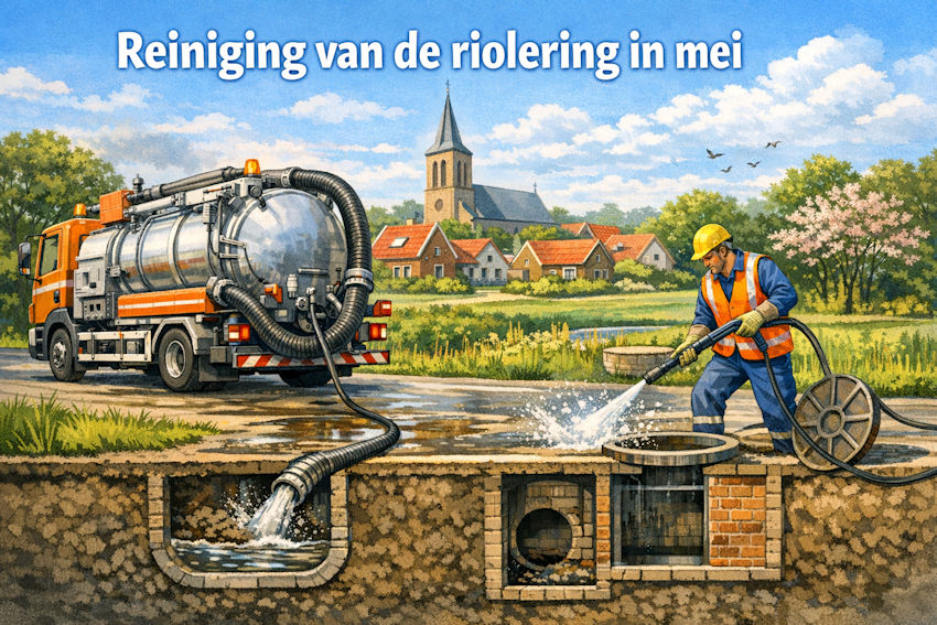 Elk jaar worden de rioleringen in onze gemeente grondig gereinigd en geïnspecteerd. Met een hogedrukspuit wordt het vuil losgespoten, waarna water en slib met een vacuümwagen worden opgezogen. Deze onderhoudswerkzaamheden starten dit jaar in april.
