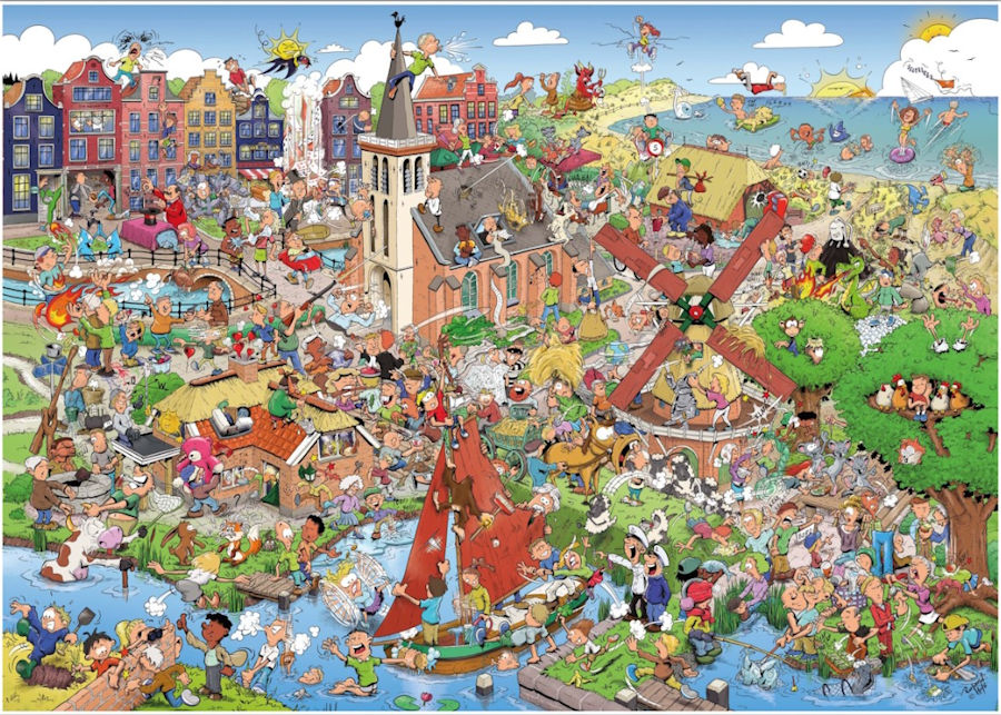 Een legpuzzel van 1000 stukjes, en tevens een puzzel om de 222 spreekwoorden en gezegden die zijn afgebeeld te vinden. Sommigen zien we meteen, anderen zijn minder bekend en staan meer verborgen.
