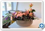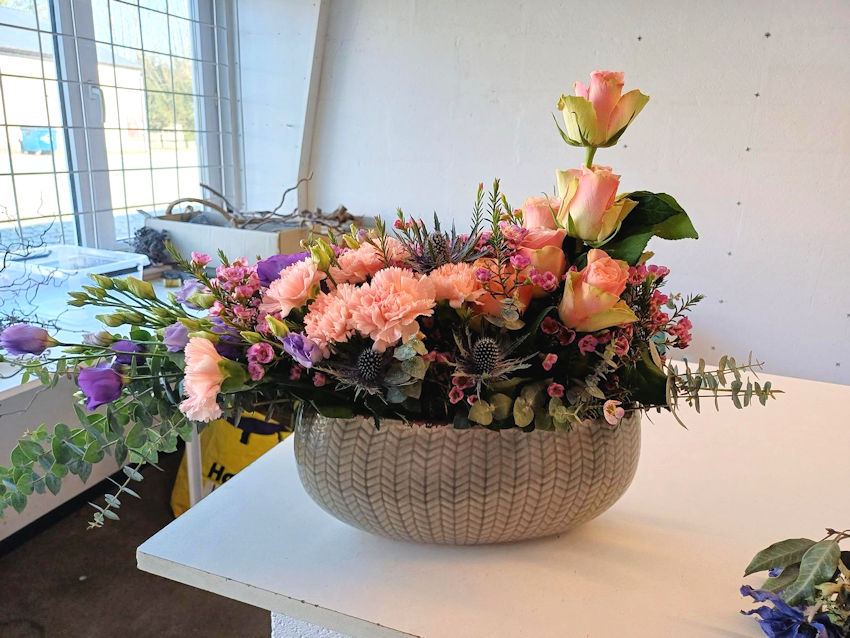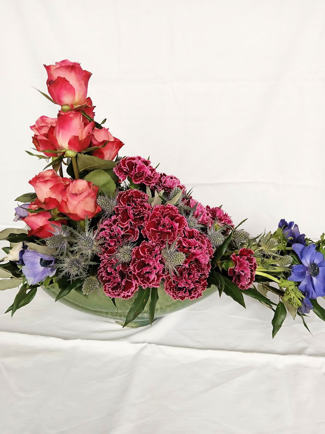 Met een oude, langwerpige schaal en veel bloemen werd woensdag een klassieke driehoekschikking gemaakt. Veel prachtige bloemen, in groepen gestoken, op verschillende hoogten, niet te veel bladmateriaal, verder niks ingewikkelds. Door de keuze van kleur en de soort bloemen zijn het allemaal totaal verschillende bloemwerken geworden. Het resultaat maakte iedereen blij.