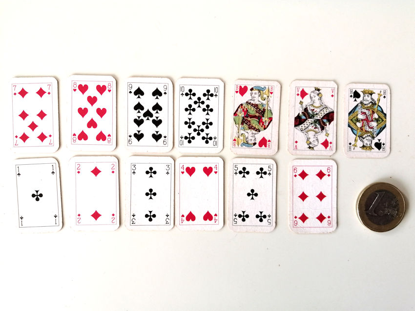 Ze zijn zó klein dat je ze bijna over het hoofd zou zien: een setje miniatuur speelkaarten van het sigarettenmerk Flyer Cigarettes, formaat luciferdoosje — 2,4 x 3,5 x 2,0 cm. Toch liggen ze daar, keurig in twee rijen, alsof ze klaar zijn voor een potje patience op kabouterformaat.