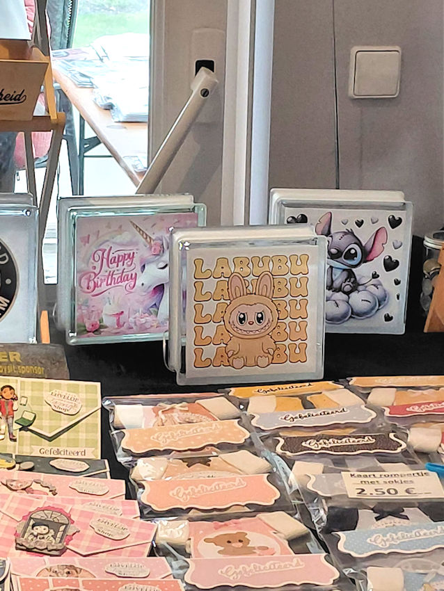 Zaterdag vond de eerste kaartenparty van het nieuwe jaar plaats, en het was meteen een gezellige drukte. Tussen de vele nieuwe hebbedingetjes viel vooral het werk van Ann op. Zij had de wintermaanden creatief benut en presenteerde allerlei leuke nieuwtjes: van glasstenen met opdruk tot witte beeldjes in diverse vormen en maten.
