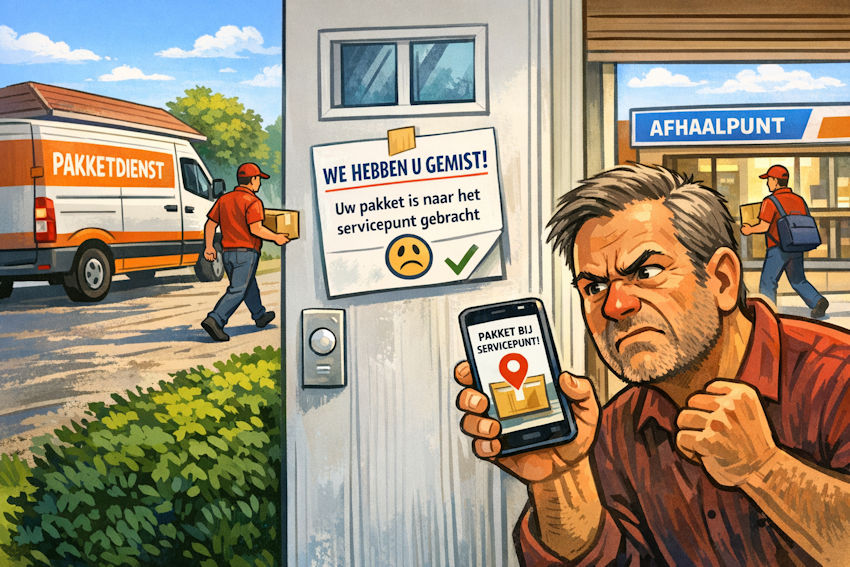 In plaats daarvan krijg je een bericht: “We hebben u gemist. Uw pakket ligt bij het servicepunt.” Vreemd, want je zat gewoon thuis. Geen bel, geen bezorger, geen pakket. Alleen een digitale boodschap en een reis naar het afhaalpunt.