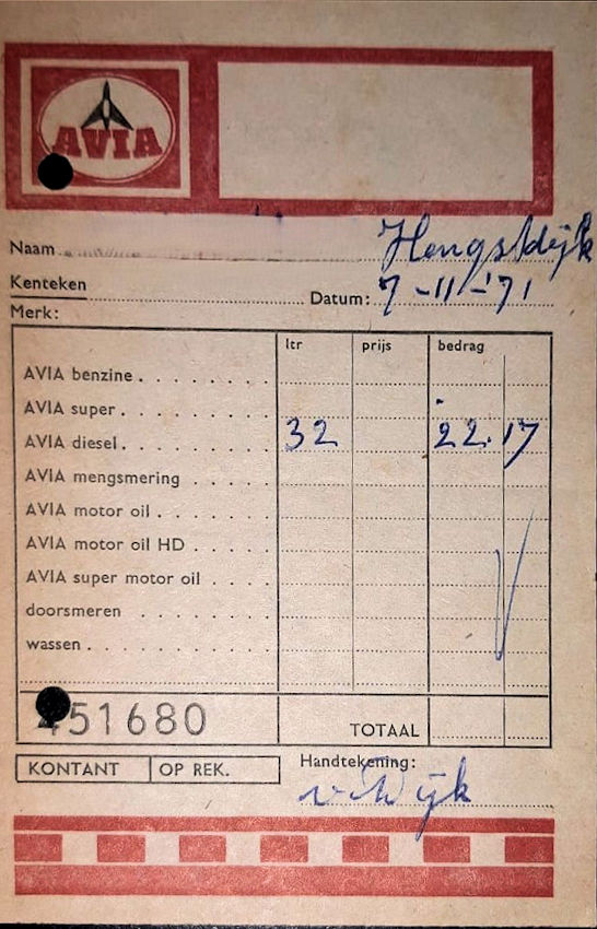 Wat hier verder opvalt is de prijs: fl 22,17 voor 32 liter diesel. Dat is nog geen gulden per liter.