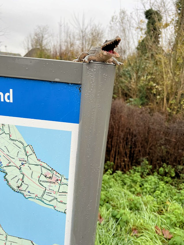 Wie deze dagen het fietspad bij Hengstdijk op wil, wordt eerst aangekeken door een onverwachte bewoner: een krokodil. Niet eentje uit de Westerschelde, maar een plastic exemplaar met open bek, strategisch geplaatst bovenop het informatiebord met de kaart van Zeeuws-Vlaanderen. Alsof hij de route wil bewaken of gewoon zin had in een frisse neus.